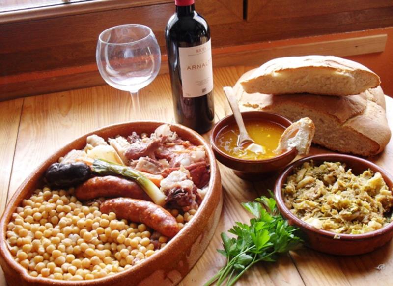11 .Presentación y servicio: Se dispone la sopa como primer platoes resto se presenta en una fuente amplia de forma que la mitad de la fuente tenga los garbanzos, una cuarta parte ella berza, y otra cuarta parte un trozo de carne, de panceta, tocino, chorizo, morro u oreja y las bolitas de relleno