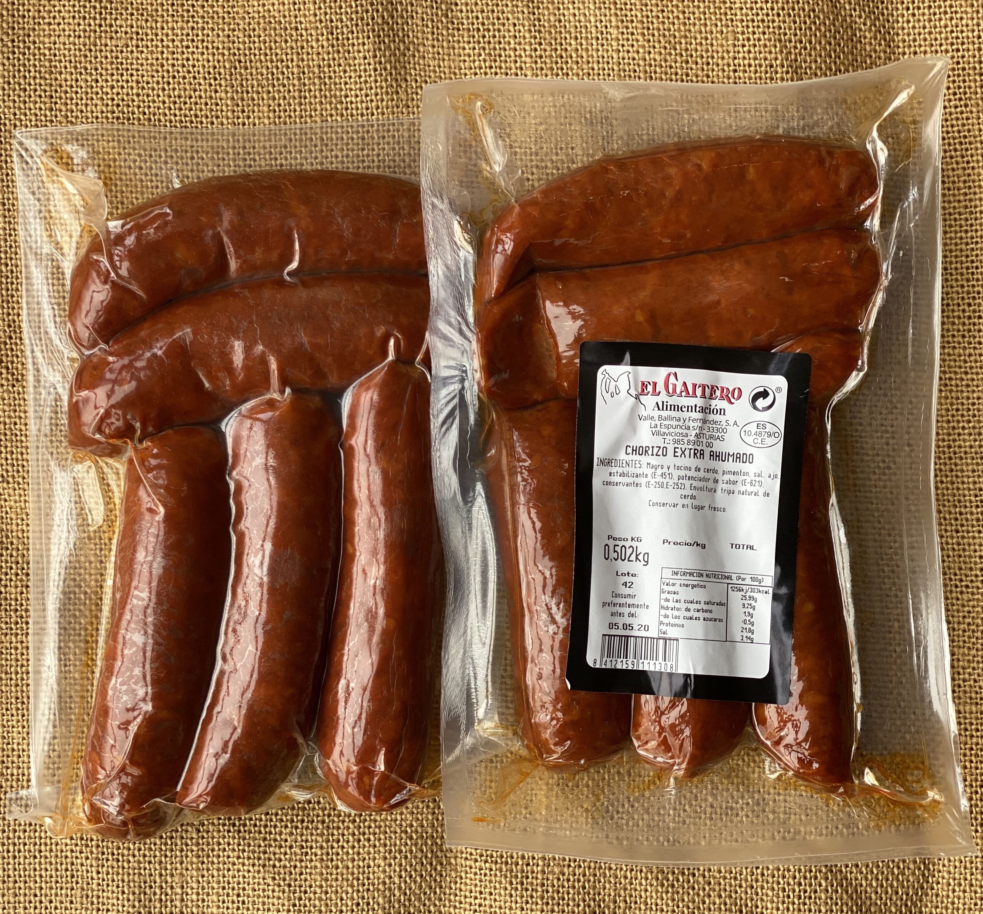 INGREDIENTES:CHORIZO EXTRA AHUMADO,(MAGRO Y TOCINO DE CERDO,PIMENTÓN,SAL,AJO,ESTABILIZANTE(E-451),POTENCIADOR DEL SABOR(E-621),